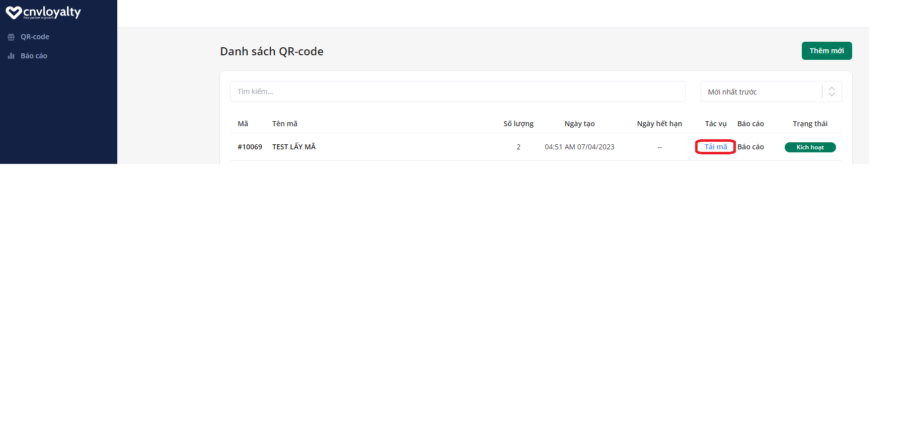 Vào danh sách QR Code chọn **Tải mã** tải về máy danh sách merchant muốn sử dụng  (file excel)&#x20;