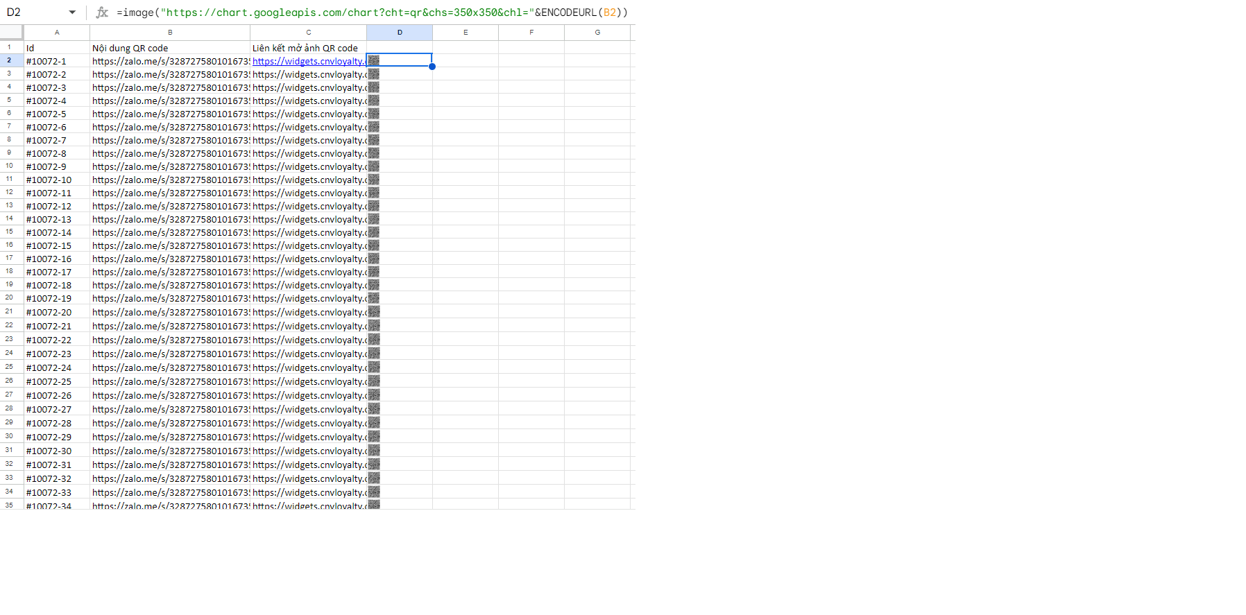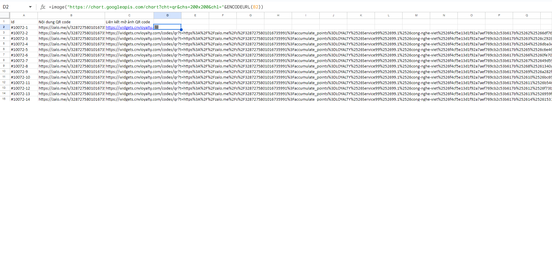 1. Sao chép và dán hàm: <mark style="color:blue;">=image("<https://chart.googleapis.com/chart?cht=qr\\&chs=200x200\\&chl="\\&ENCODEURL(B2)>)</mark>  vào cột kế bên cột **Liên kết mở ảnh QR code**